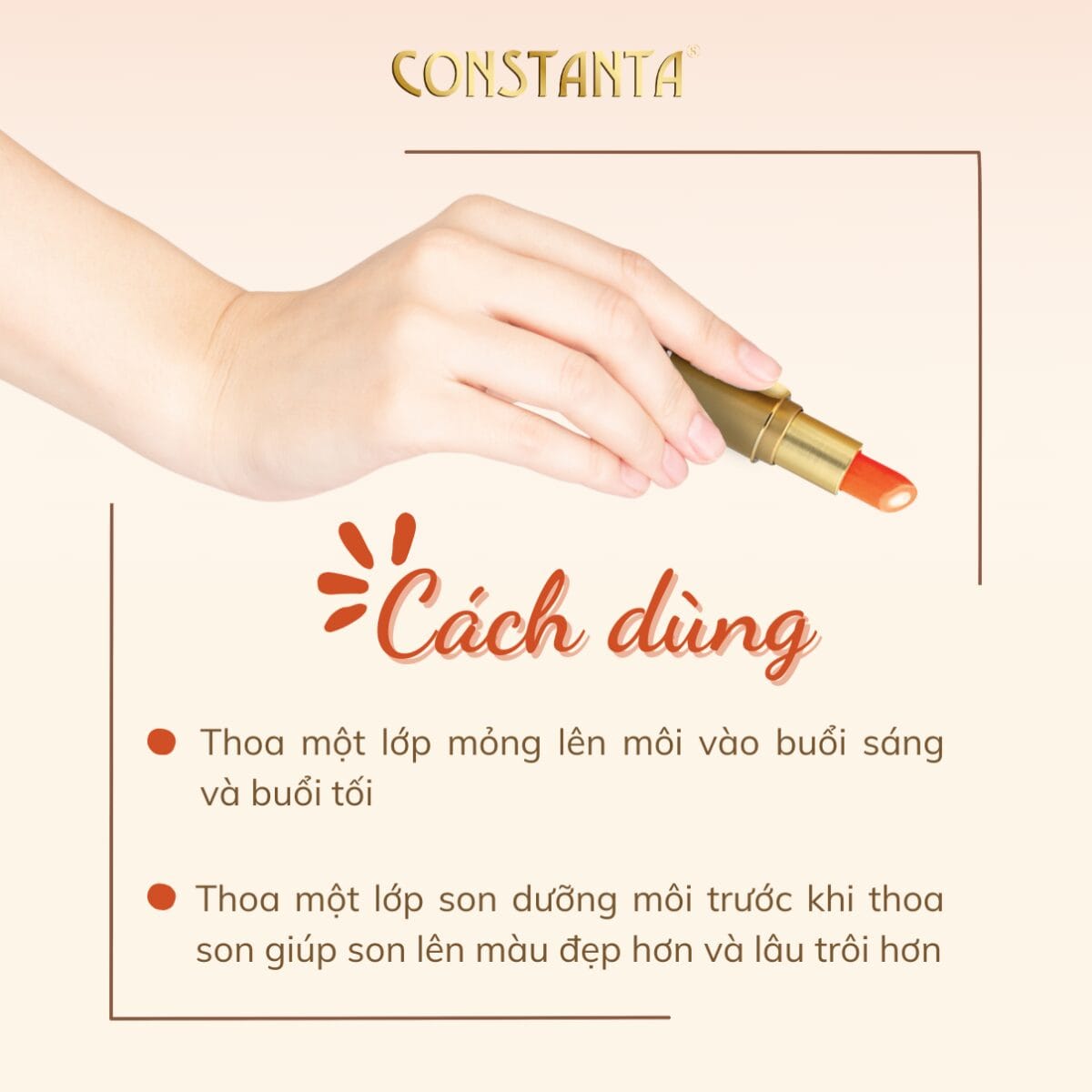 Để đạt được hiệu quả tốt nhất, hãy sử dụng Son Dưỡng Môi Constanta Lip Treatment hàng ngày. Thoa một lớp mỏng lên môi vào buổi sáng và buổi tối, hoặc bất cứ khi nào bạn cảm thấy môi cần được dưỡng ẩm. Sản phẩm này có thể được sử dụng đơn lẻ hoặc kết hợp với các sản phẩm dưỡng môi khác để tăng cường hiệu quả.